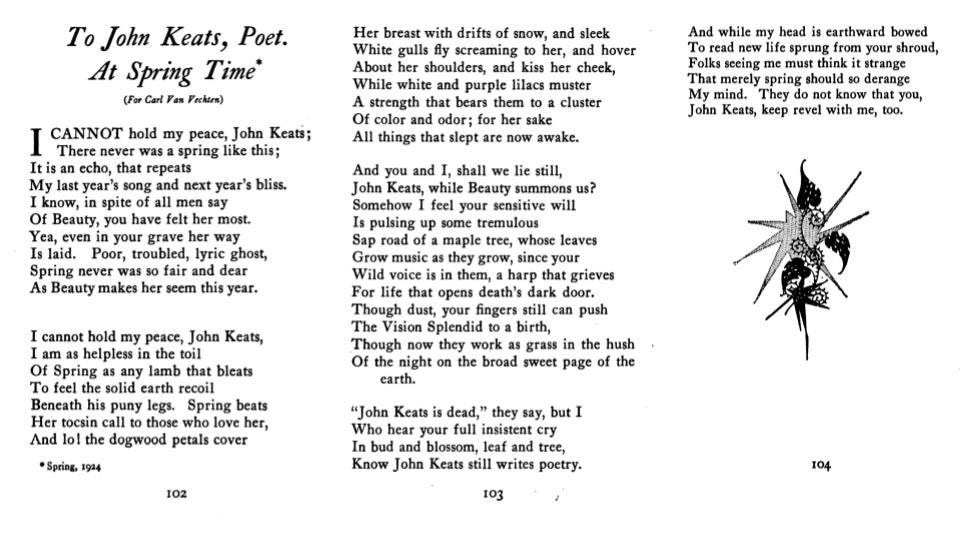 Late in “Heritage,” in the same collection, Cullen writes, “Lest the grave restore her dead.” What is spring if not a restoration of the dead? The speaker of “To John Keats” is not an exception, for he already seems to speak from the grave when he says of spring, “It is an echo, that repeats / My last year’s song and next year’s bliss.” Although it is possible to read “last year’s” as the preceding year, given the subject and tenor of the poem, a more plausible reading would be final year. For unless the speaker were in fact speaking from beyond the grave, how could spring be an echo which repeats next year’s bliss when next year has not yet arrived? Consequently, taken together these lines suggest the collapse of time as well as the boundaries between life and death.