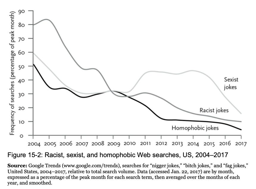 Of course, there are still people who hold racist beliefs and enact racist behaviors. Researcher Seth Stephens-Davidowitz, author of the 2014 book Everybody Lies: Big Data, New Data, and What the Internet Can Tell Us About Who We Really Are, uncovered evidence of explicit racial hatred through Google searches. The racial epithet, in either singular or plural form, used in seven million American searches every year is “nigger”—often as searches for “nigger jokes.” (Fortunately, however, as Steven Pinker points out in his 2018 book, Enlightenment Now The Case for Reason, Science, Humanism, and Progress, searches for racist jokes are on the decline, as the figure below shows.) To take another example, racial prejudice appears to have a negative effect on the wages of workers racialized as black. Indeed, “at least one third of the black-white wage gap” may be explained by racial prejudice.