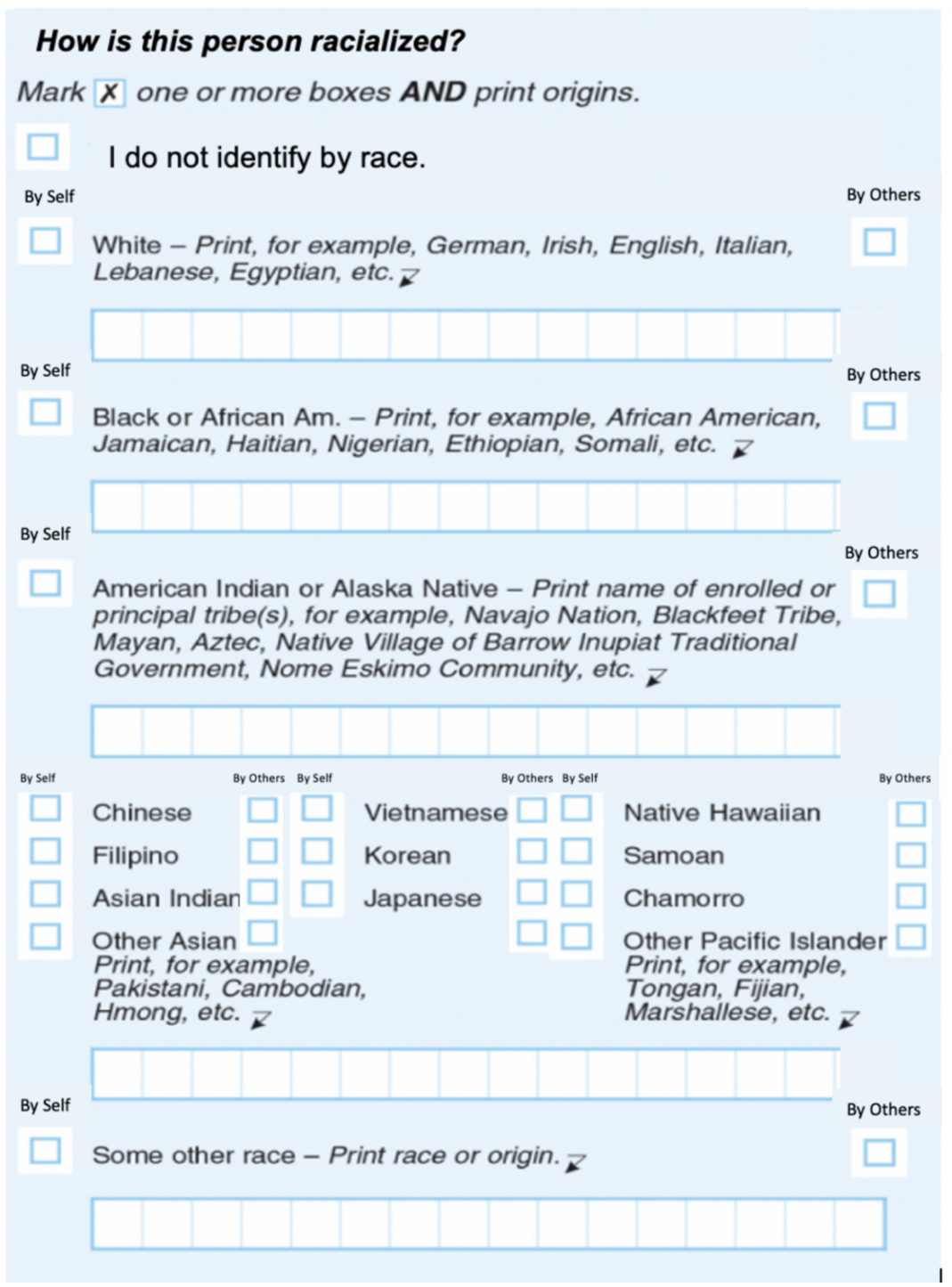 Disaggregating race from the state can begin through the U.S. Census, which currently compels people to racialize themselves by asking: “What is this person’s race?” Carlos Hoyt recommends adding this question: “How is this person racialized?” By making note of how others racialize us, the government could still track bias, discrimination, and differential outcomes based, at least partly, on how one is racialized. Furthermore, those who don’t identify by race at all could check a box. And those who wish to continue racializing themselves can do so, too. The 2030 Decennial Census Form, then, could look like this: