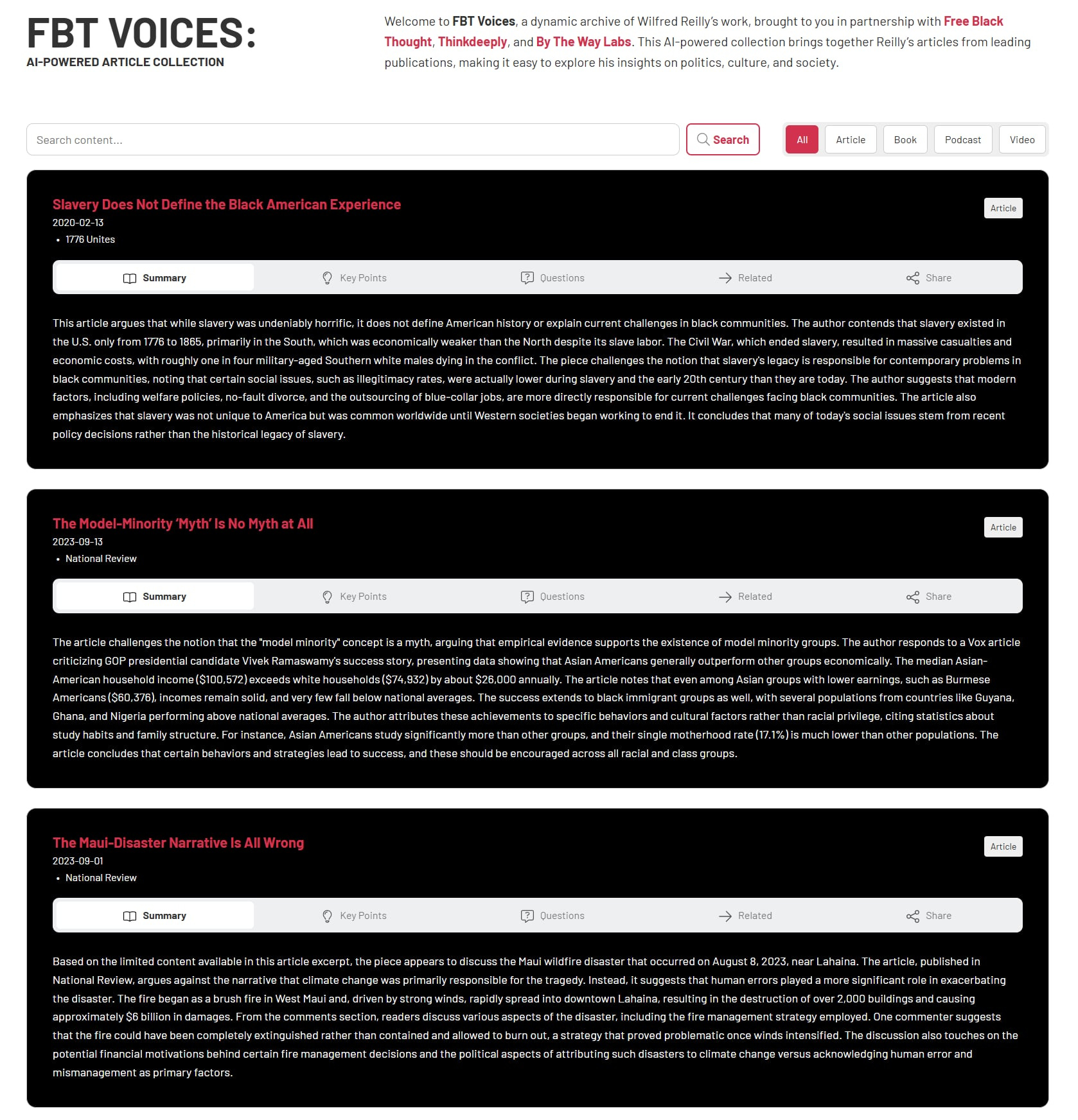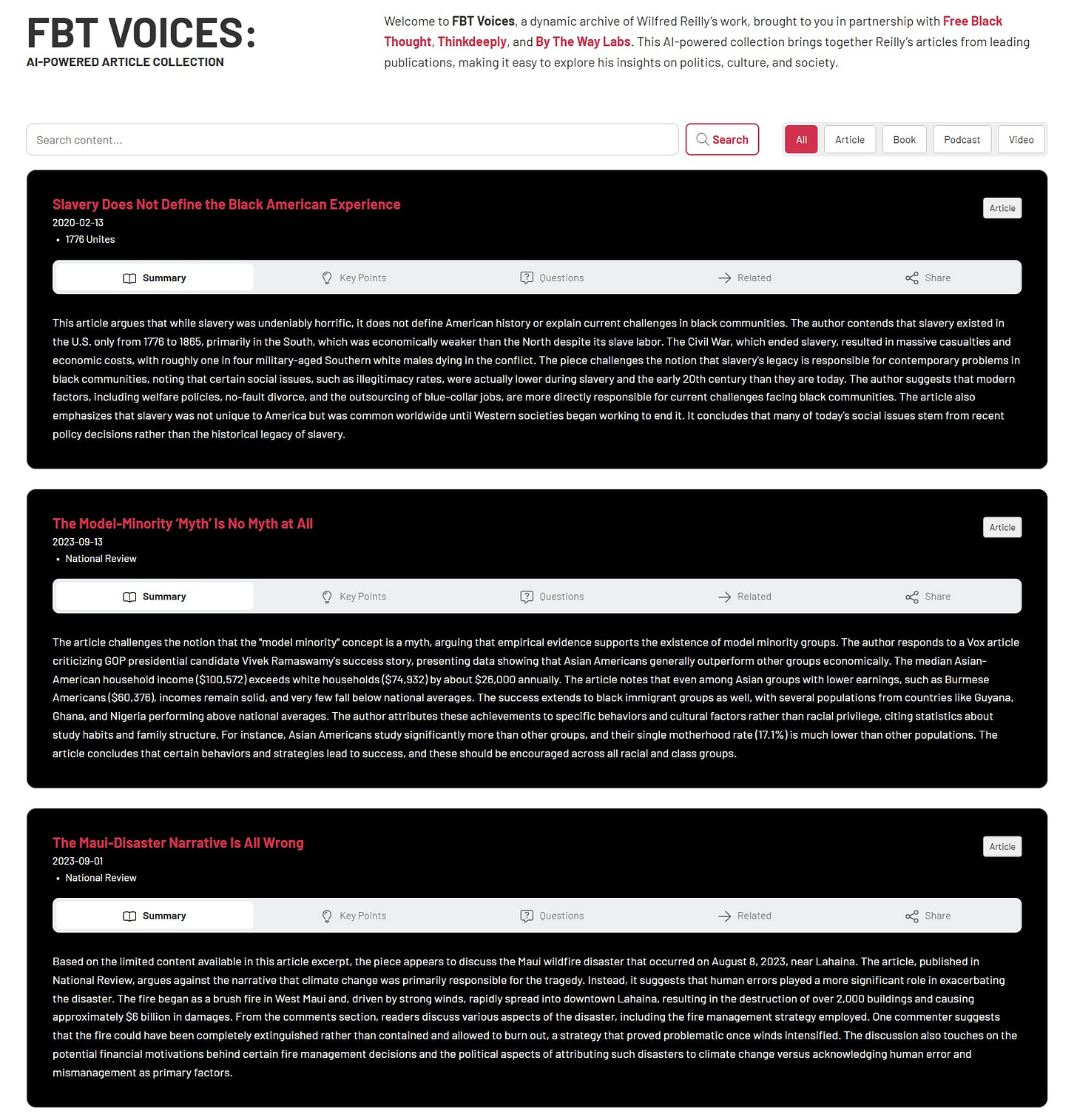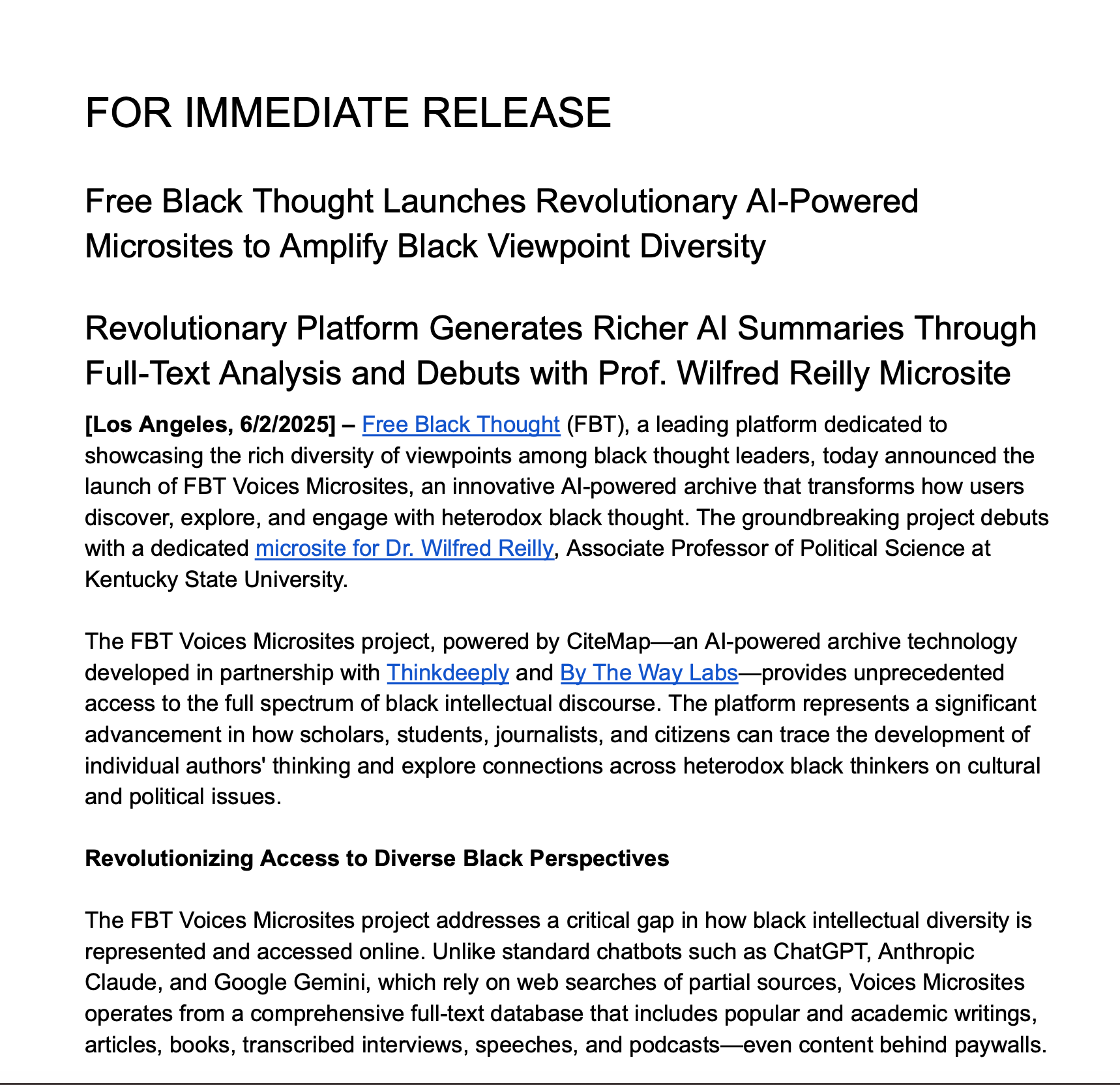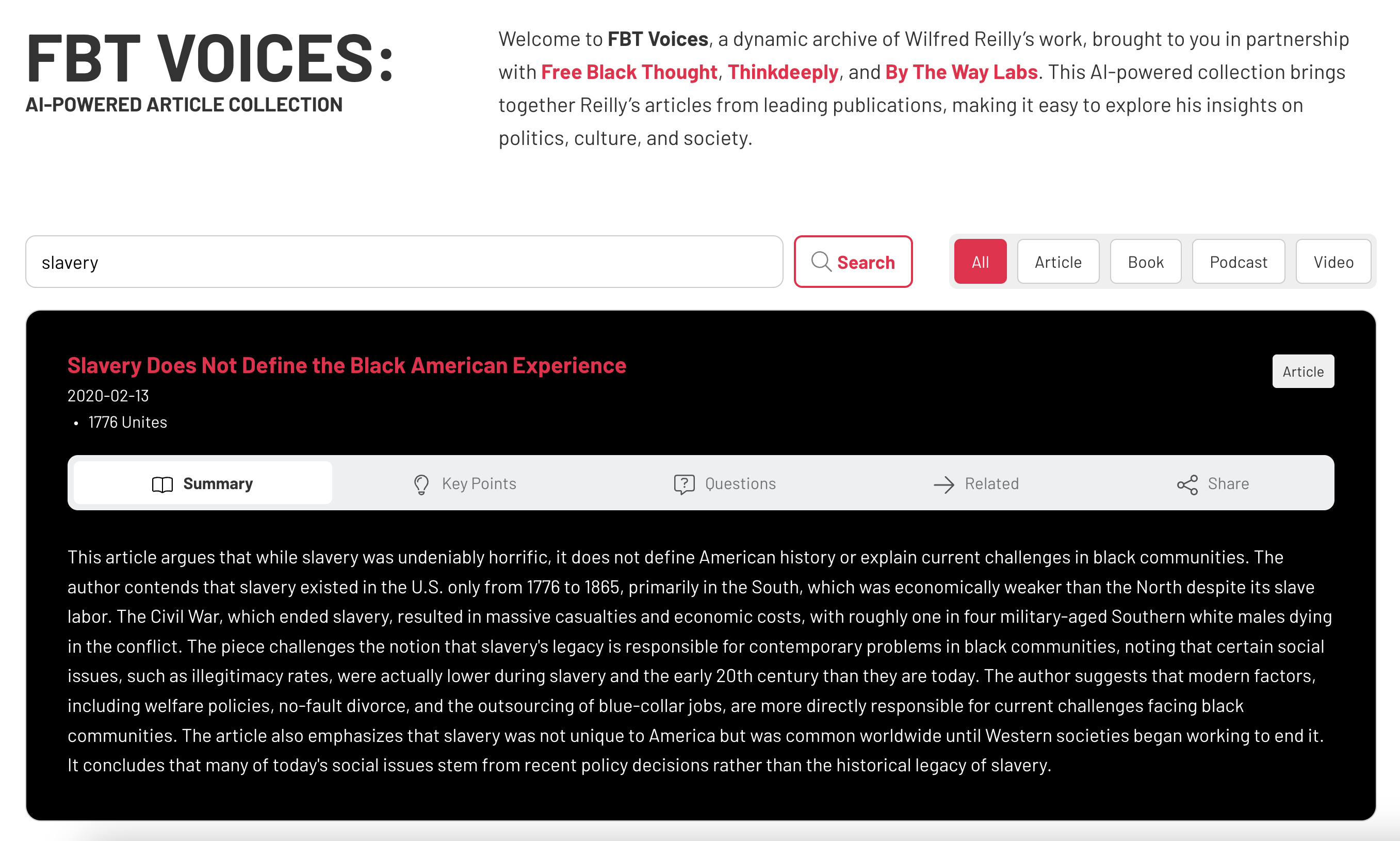 The FBT Voices Microsites is like nothing else out there. ChatGPT, Claude, Google Gemini, Grok, and other LLMs rely on web searches of fragmented, partial sources and cannot access content behind paywalls. In contrast, FBT Voices Microsites is the only AI that has comprehensive, full-text databases of the work of heterodox black thinkers, including their paywalled content. Unlike other LLMs, our databases include a given thinker’s popular and academic writings, articles, and books, and even transcriptions of their interviews, speeches, and podcasts. The platform’s full-text access, utilizing our proprietary CiteMap AI-powered archive technology, enables richer, more detailed summaries (see the image below) while adhering to fair use guidelines for protected works.