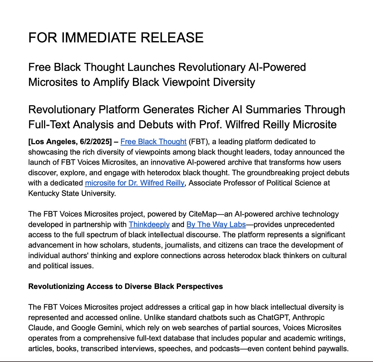 FBT is proud to announce the launch of FBT Voices Microsites, a unique AI-powered archive that transforms how you discover, explore, and engage with heterodox black thought. Our groundbreaking project debuts with a dedicated microsite for Dr. Wilfred Reilly, Associate Professor of Political Science at Kentucky State University.