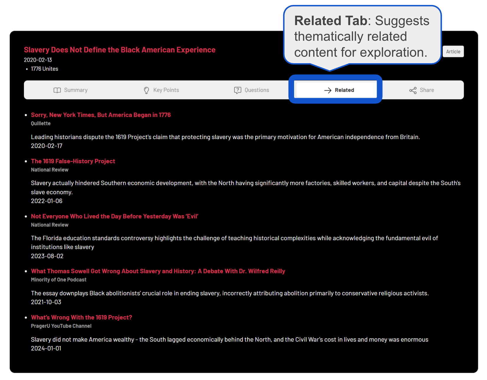 Curious Citizens: Browse and discover new perspectives through accessible summaries and curated related content.