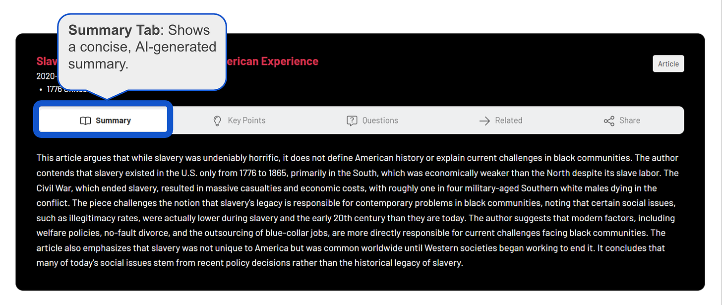 When you search for a term (or terms), you get a list of CiteMap media cards, each one displaying a relevant source plus its summary. For example, if you search for “slavery” on Prof. Reilly’s Microsite, the AI will return this media card at the top of the list: