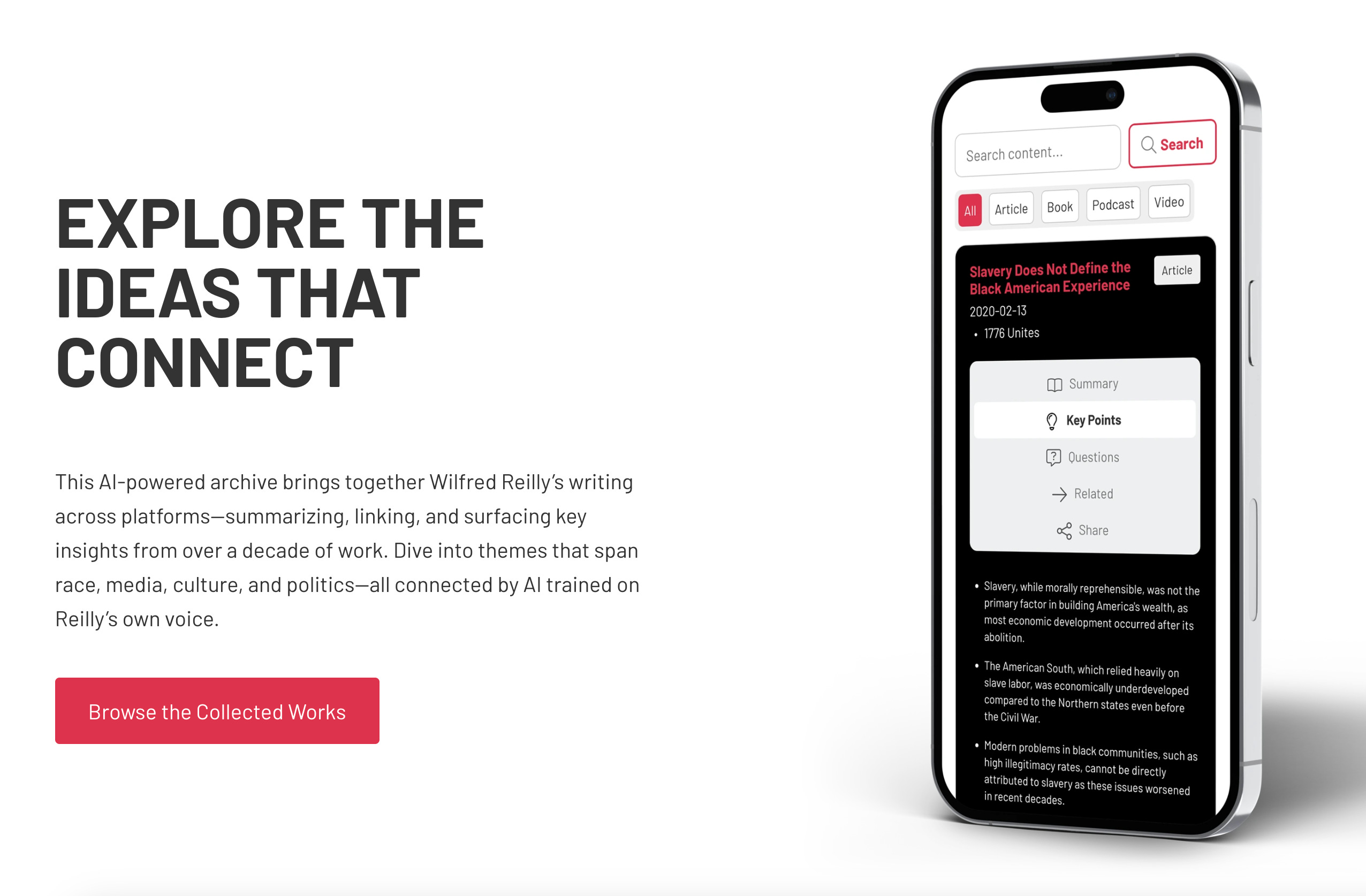 Prof. Reilly’s Microsite at www.wilfredreilly.com provides users with comprehensive access to all these books and articles, as well as his media appearances, through our unique AI-powered interface. No other AI has the access we do.