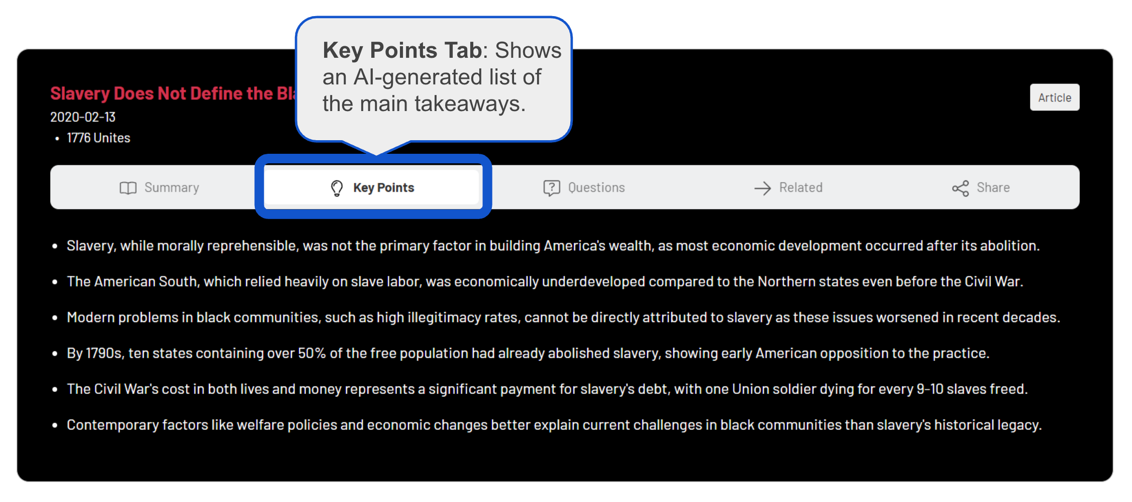 The next tab, “Key Points,” gives you a bullet-pointed list of takeaways from the source: