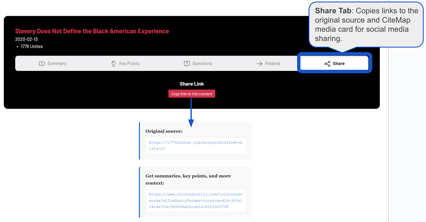 The final tab, “Share,” copies to your clipboard a link to the original source AND to our media card. We envision this function as not only useful for readers who wish to share our media cards and the sources they represent, but also for authors/creators, who can paste the link to the card into their social media posts. This will allow their followers who don’t have access to paywalled content to get a solid summary of the item they have written or produced. Indeed, even for those who do have access, this feature allows them to preview the source before they dive in and read/watch/listen to the whole thing. In both cases, authors/creators will find that sharing our link increases engagement with their content.