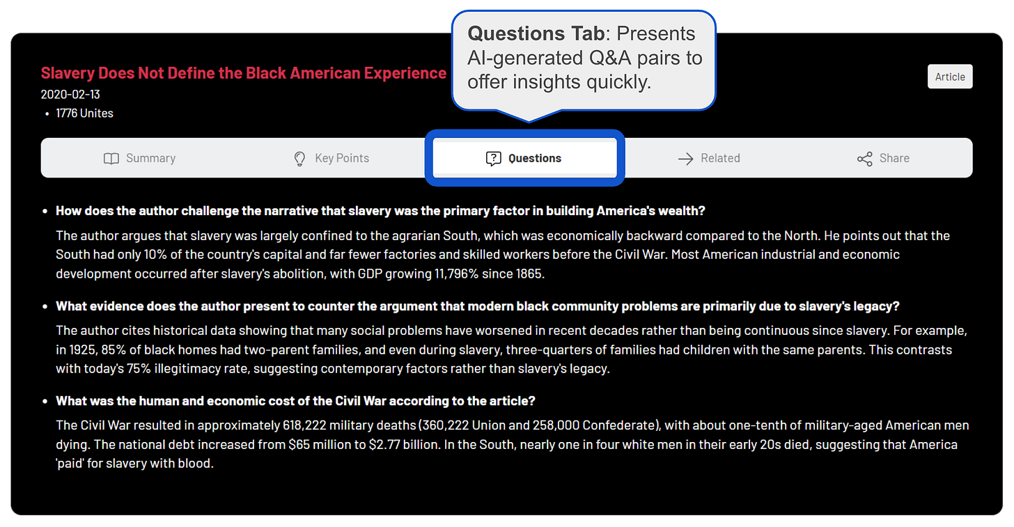 The middle tab, “Questions,” presents questions that might arise about the source along with detailed answers: