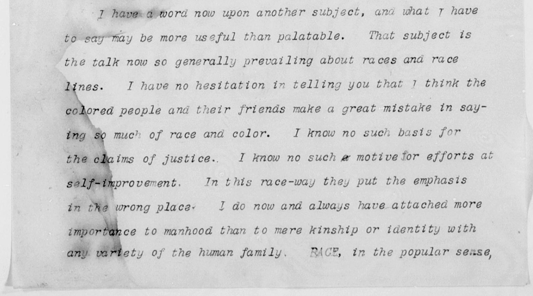 I have a word now upon another subject, and what I have to say may be more useful than palatable. That subject is the talk now so generally prevailing about races and race lines. I have no hesitation in telling you that I think the colored people and their friends make a great mistake in saying so much of race and color. I know no such basis for the claims of justice. I know no such motive for efforts at self-improvement. In this race-way they put the emphasis in the wrong place. I do now and always have attached more importance to manhood than to mere kinship or identity with any variety of the human family.