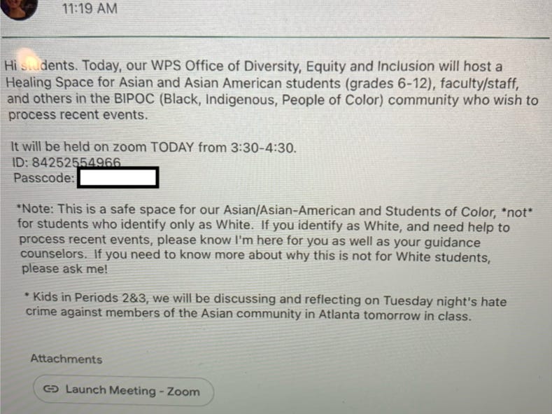 This “safe space” rationale is spelled out in an invitation to a “Healing Space” for “Asian and Asian American students and others in the BIPOC (Black, Indigenous, People of Color) community” sent by Wellesley Public Schools in Wellesley, MA (Figure 12). The invitation carefully specified that white students were not allowed:
