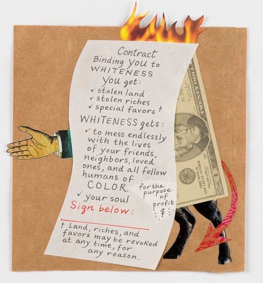The thesis that being white confers privilege or that it involves domination of others can devolve into condemnation of an essentialized “whiteness” as such, as in the case of Anastasia Higginbotham’s 2018 children’s book, Not My Idea: A Book About Whiteness (Figure 3). The book teaches children that they can “sign” a “contract” with “whiteness,” which is represented by a collage image of the devil. “White” children get “stolen land, stolen riches, and special favors.” In return, “whiteness” gets “to mess endlessly with the lives of your friends, neighbors, loved ones, and all fellow humans of COLOR” as well as “your soul.”