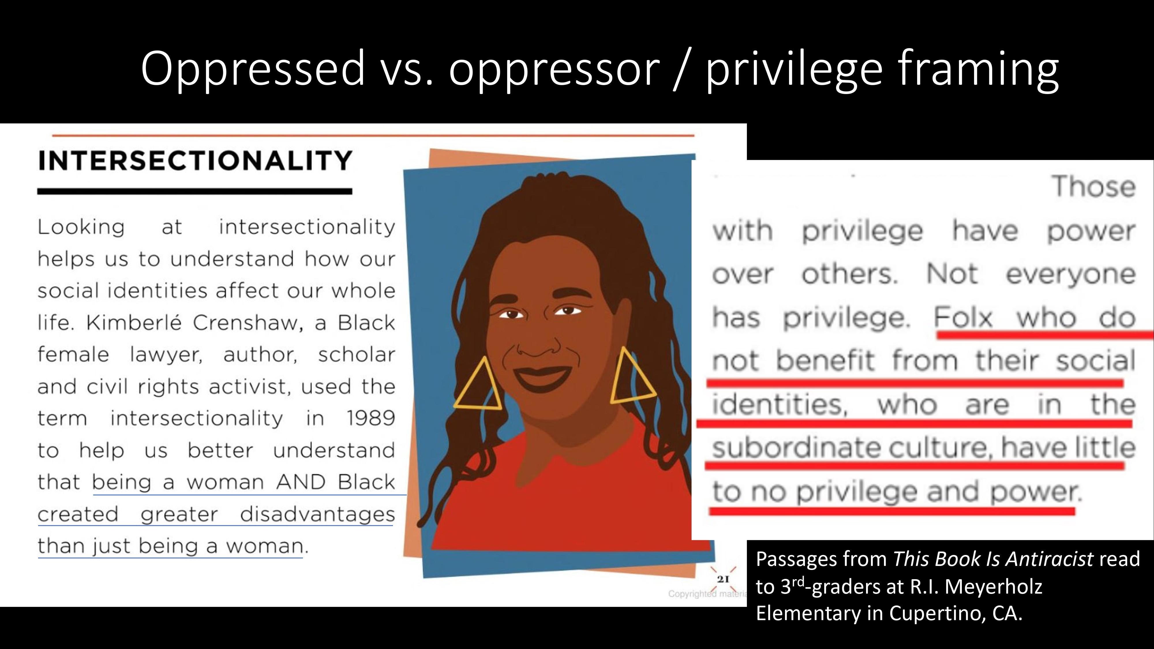 An example of intersectionality in K-12 comes from a lesson taught to third-graders at R. I. Meyerholz Elementary School in Cupertino, California. The eight-year-old children were read passages from This Book Is Antiracist which explained that “being a woman AND Black created greater disadvantages than just being a woman.” The book also teaches: “Folx who do not benefit from their social identities, who are in the subordinate culture, have little to no privilege and power” (see Figure 5).