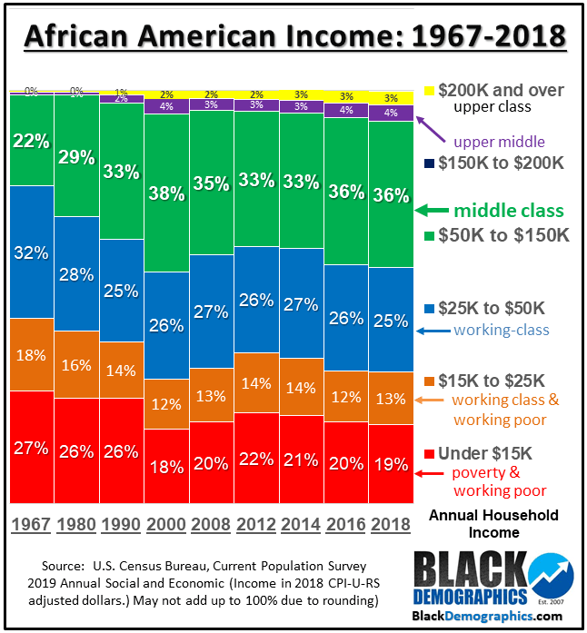 ● Many people reflexively associate being black with being poor. However, while 19% of black people do live in poverty, most black people are working class, middle class (the largest share), or higher (Figure 7).