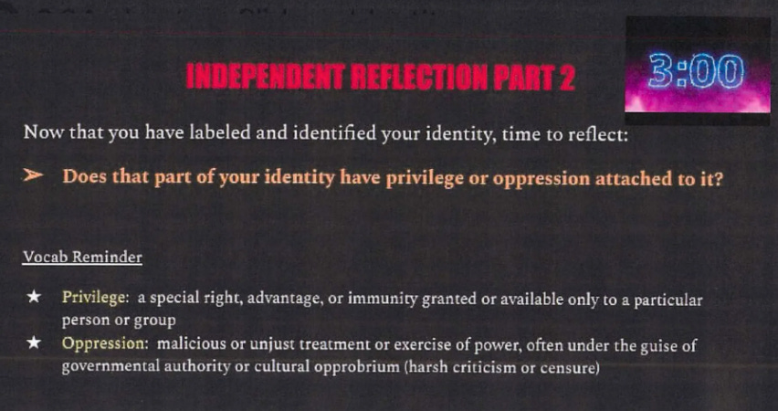 So far, we’ve discussed the potential problems that the oppressor vs. oppressed dichotomy may present for white children. This framing can, unsurprisingly, present problems for black and “mixed” children as well. Consider the case of William Clark, the “mixed” son of a black mother, Gabrielle Clark. In his senior year at Democracy Prep charter school in Las Vegas, he took a class in which he was asked to “label and identify” the various aspects of his “identity.” He was then asked to assess whether each aspect of his identity had “privilege or oppression attached to it” (see Figure 4).
