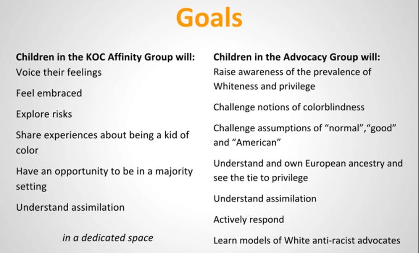 A few years earlier, the Bank Street School for Children in New York City had done something similar (Figure 14). It established a “KOC Affinity Group” for “Kids of Color” and an “Advocacy Group” for white students, in which children were encouraged to develop “awareness of the prevalence of Whiteness and privilege” and taught to “understand and own European ancestry and see the tie to privilege.”