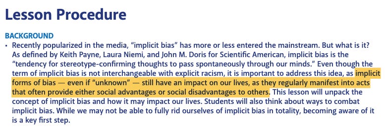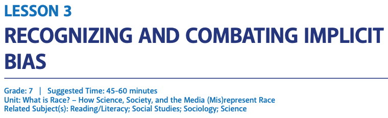 Let’s look at an example. This is how the Pollyanna Racial Literacy Curriculum represents implicit bias in its seventh-grade curriculum (Figure 23):