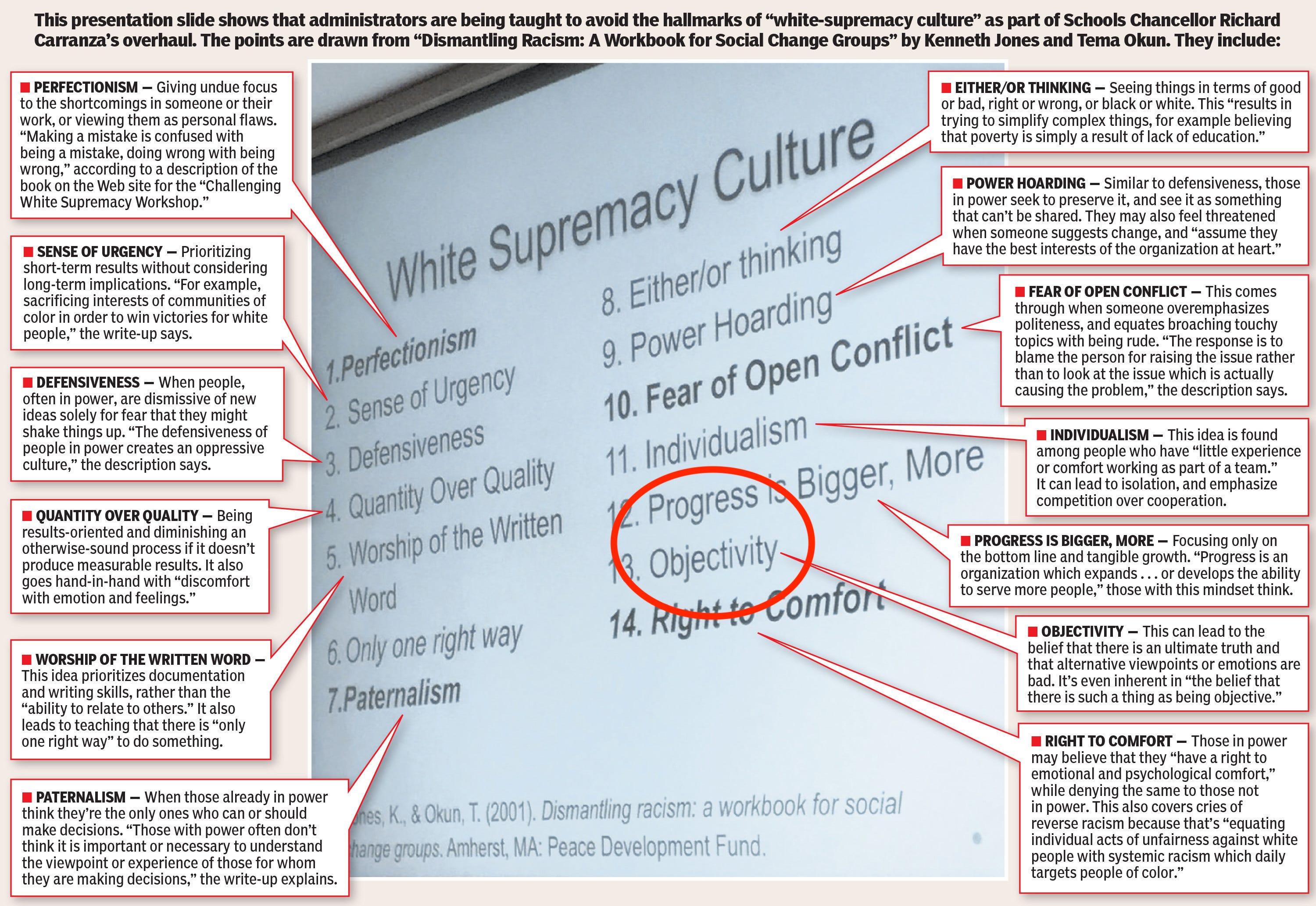 There’s a lot that can go wrong with teaching children about “white supremacy culture.” Note that to teach this framework is, at the end of the day, to tell educators and children—and specifically to target the message to and about black children—that self-reliance, working hard, politeness, thinking objectively, taking an interest in the written word, delaying gratification, planning for the future, and being an individual are “white” or “white supremacist.” One has to ask just how personally empowering and motivating this message might be for black children. And one has to ask what effect this message about black children might produce in educators. How much positive reinforcement will a teacher committed to the message of Okun or Katz give to a black student who loves Computer Science, a field that utilizes “objective, rational linear thinking”? Will such a teacher hold a black student who has been shirking her writing assignments to a high standard? Or will that teacher decline to do so, chalking her disinterest in the written word up to her “blackness”?