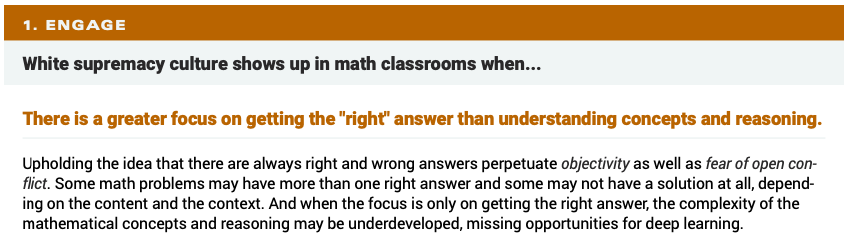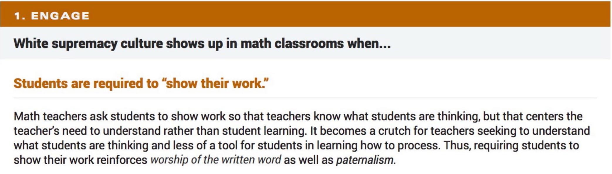 Some DEI practitioners employ the “white supremacy culture” framing (see section 2 above) to alter or eliminate time-tested methods of teaching math. This way of thinking about math education supplements detracking (“White supremacy culture shows up in math classrooms when...Students are tracked”) with Tema Okun’s theory of white supremacy culture, which we discussed above.