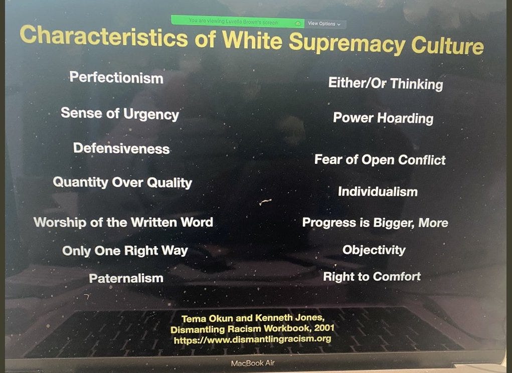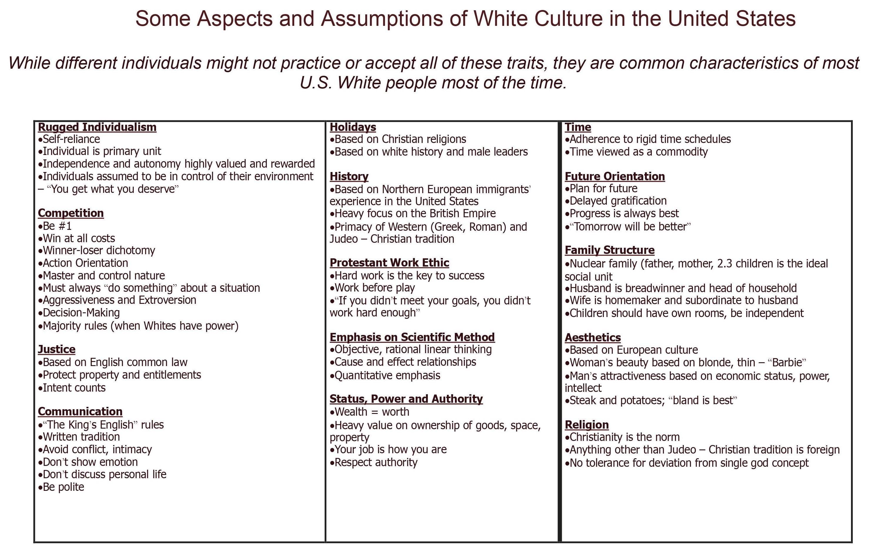 Another framing commonly encountered in DEI curricula is that of “white supremacy culture.” This concept is primarily associated with two names, Tema Okun and Judith Katz. The hallmark of the white supremacy culture thesis is that many of the traits and supposed virtues valued in American society, such as “objectivity,” “rational, linear thinking,” “worship of the written word,” and “planning for the future” are distinctively and uniquely “white” cultural constructs.