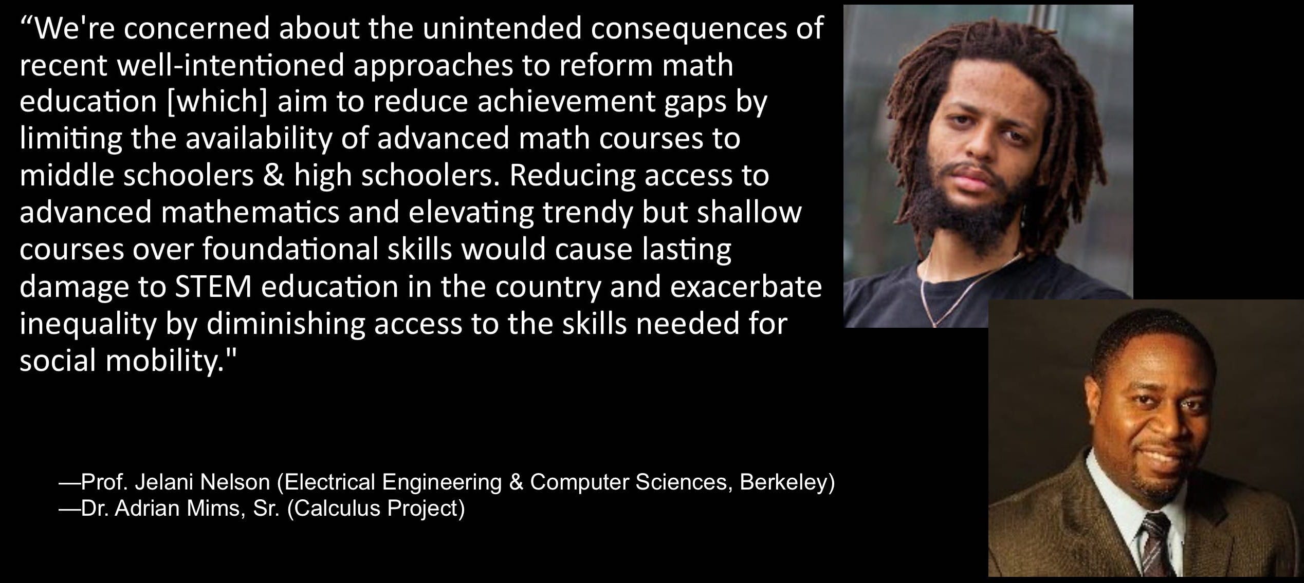 Of special note are the efforts of Jelani Nelson, Professor of Electrical Engineering and Computer Sciences at UC Berkeley, and Dr. Adrian Mims, Sr., of the Calculus Project. They published a deep critique of the California Math Framework, predicting that the framework will “make it very difficult for students to be able to reach calculus.” And they note that the CMF is informed by interpretations of the available research that are both bad and selective. They conclude that “it is irresponsible to make such radical (and detrimental) recommendations for the education of students in our largest state based on inconclusive or cherry-picked evidence.”