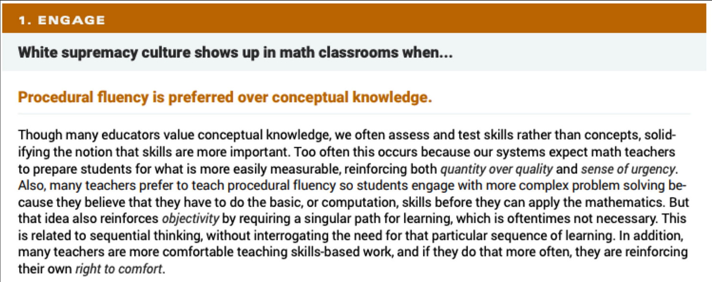 Other manifestations of white supremacy culture in math include a preference for “procedural fluency” over “conceptual knowledge” and “getting the ‘right’ answer” (Figure 21). Supposedly, these are “white” cultural values, particularly that of objectivity, a sin familiar from Tema Okun’s work.