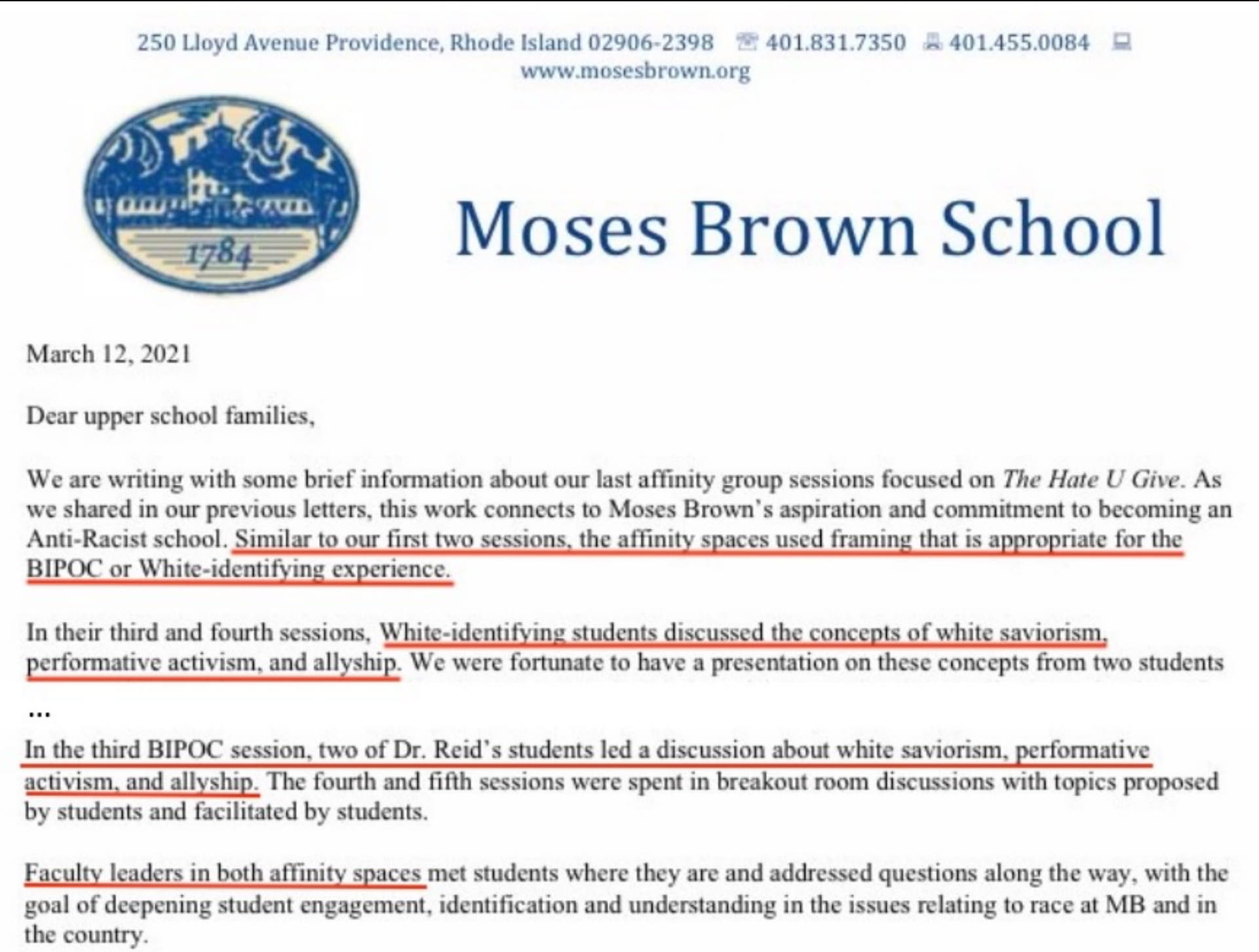 Segregated spaces in Wellesley Public Schools followed an anti-Asian incident, but other schools have taken to segregating students during the normal school day, such as Moses Brown School in Providence, RI. Administrators sent parents of its high school students a letter (Figure 13) detailing how children were split up into two “affinity spaces,” one for “White-identifying” (original capital W) students and one for “BIPOC,” or “Black, Indigenous, and People of Color,” students. The spaces featured different lessons, or in the words of the school, “framing…appropriate to the BIPOC or White-identifying experience.” These “framings” covered popular topics in DEI ideology: “white saviorism” (no capital W this time), “performative activism,” and “allyship.” Separate but, one must presume, equal, in the eyes of the school.