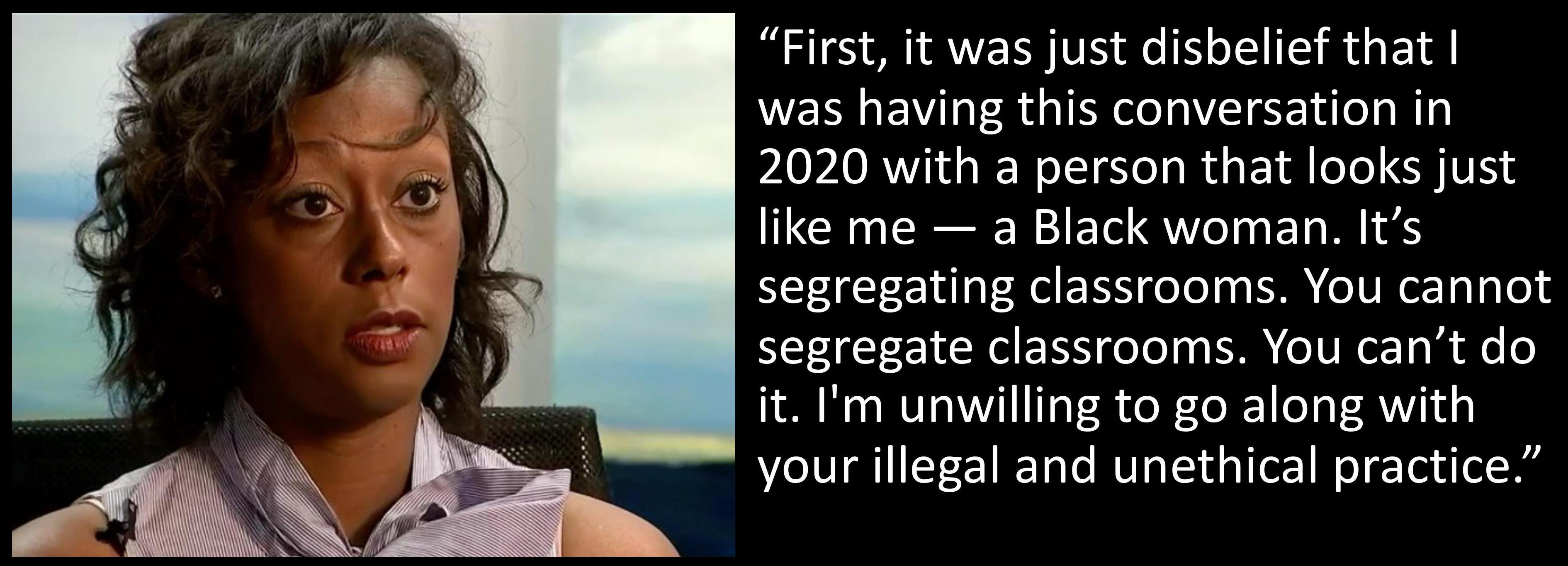 When a similar practice was instituted in the second grade at Mary Lin Elementary School in Atlanta in 2020, Kila Posey, a black parent, PTA member, and educator, filed a federal discrimination complaint alleging civil rights violations with the U.S. Department of Education. Ms. Posey describes her initial conversations about her daughter’s segregation with Principal Sharyn Briscoe, who is also black (Figure 15):