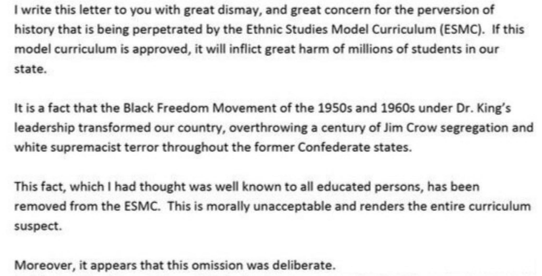 More damningly, Dr. Clarence Jones—a close associate of MLK and currently Visiting Professor at the University of San Francisco—wrote to Gov. Newsom and Superintendent of Public Instruction Tony Thurmond to condemn the ESMC and defend the Civil Rights movement in which he had played a key part. Among the ESMC’s omissions: its list of 154 “Important Historical Figures Among People of Color” did not so much as mention Martin Luther King, Jr., or John Lewis (or, for that matter, Frederick Douglass, W.E.B. Du Bois, or Thurgood Marshall, among others).