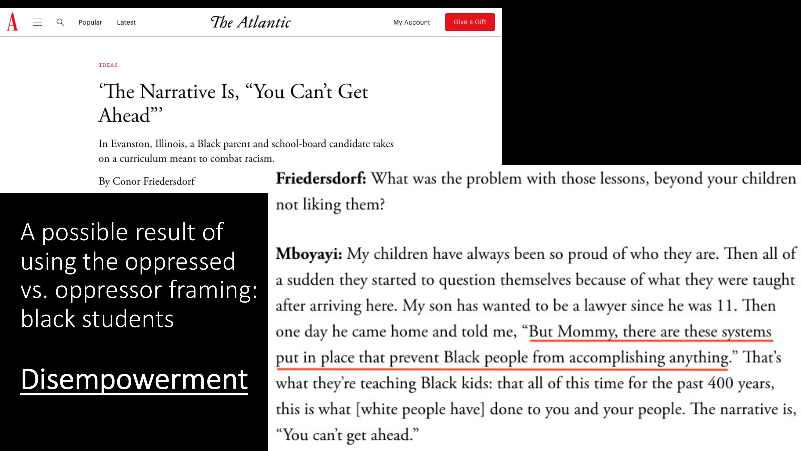 We’ve seen that the oppressed vs. oppressor framing used in K-12 DEI lessons may have negative consequences for children, and that these negative consequences differ by race and gender, as a result of the differing ways in which DEI ideology portrays different races and genders. In general, white children may be demonized for their “whiteness” while black children may be disempowered by messages about the pervasive oppression they must labor under.