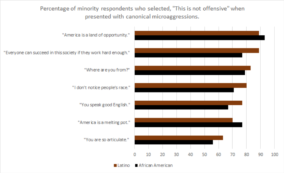 Let me present something I got from a publication by Musa Al-Gharbi. There was a study done on microaggressions where the researchers polled ethnic and racial minorities on whether a statement was offensive or not. In the microaggression literature, the following statement is said to be a microaggression: “America is a land of opportunity.” Well, as you can see, over 90% of black people and just under 90% of Latinos do not think that that's a microaggression. Another microaggression is asking “Where are you from?” Roughly 83% of Latinos do not find that offensive. They might say, “Well, I'm from Guatemala”, or they might say “My parents moved here from Peru and I was born in Los Angeles!” They just don’t care—they’re not bothered by it!